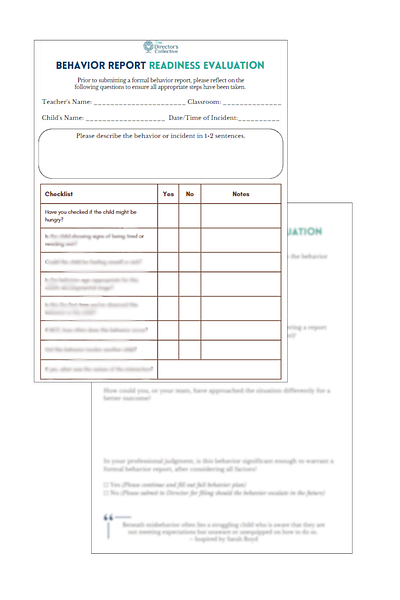 The director will use the Pre-Evaluation alongside the behavior report to determine the severity of the incident. This helps ensure that only necessary reports are sent home to parents, reducing the risk of over-reporting while maintaining clear communication about truly concerning behaviors.