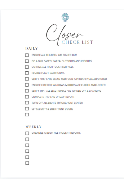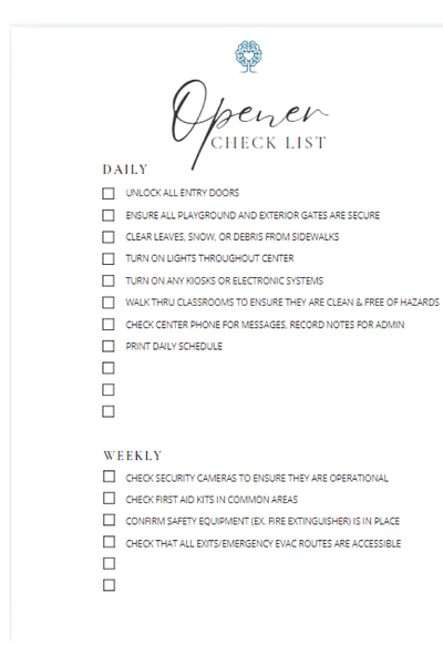 Below are easy to download checklists for both the Opener and Closer. There is one copy with some pre-filled tasks that you can print and start to use immediately, and another blank copy if you need to create one specific to your center.