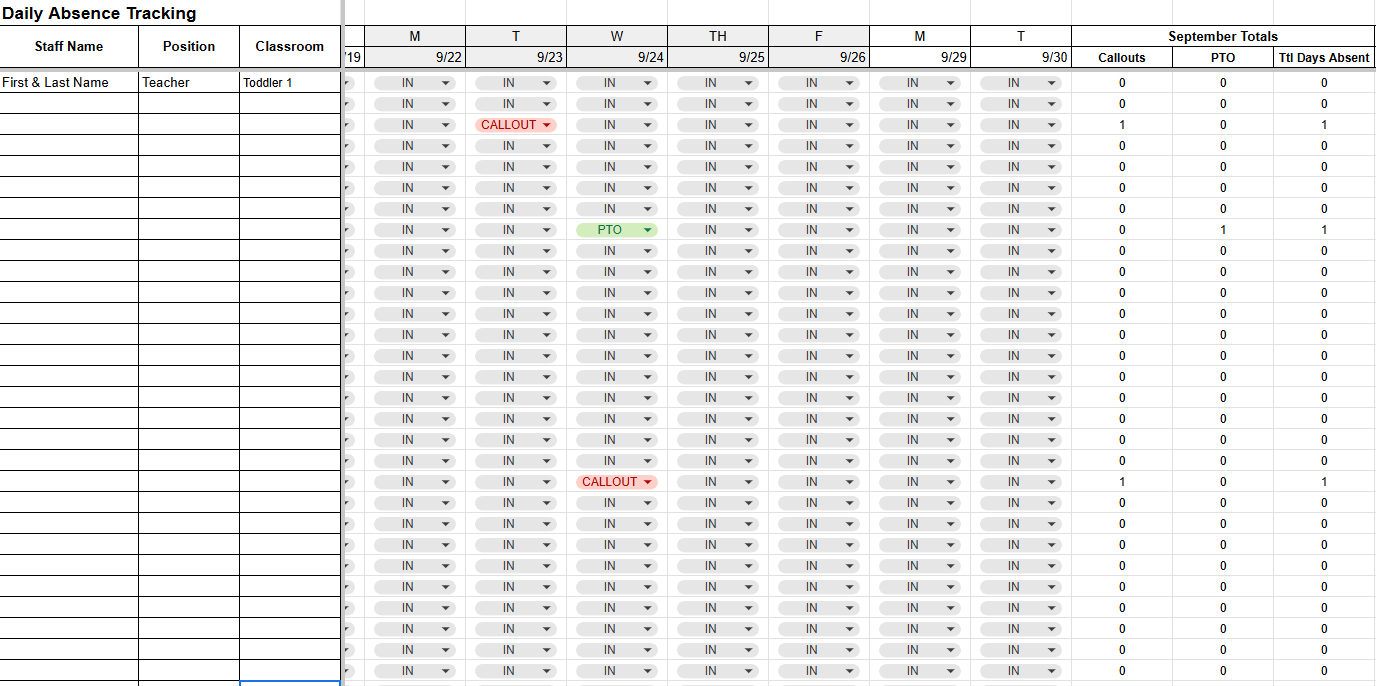 I then use the By Month tab to to show me absences by day by employee for each month. If you are saavy with formulas or charts, you could easily add additional tabs for visuals or other metrics important to your center!