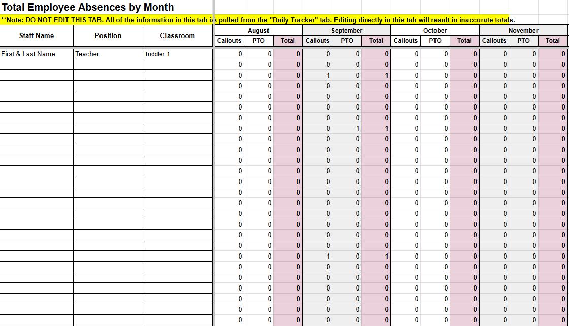 The Daily Tracker is your input tab. This is where you update daily absences/reasons.
