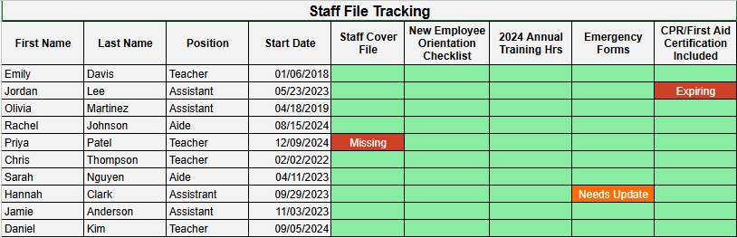 This week (and likely next), create a simple checklist to track your staff and child files. You can use a spreadsheet or even jot it down by hand. On the left-hand side, list every staff member or enrolled child (in separate documents.) Across the top, write out all the required forms you need to have in their file—things like immunization records, emergency contact forms, background studies, or CPR certification.